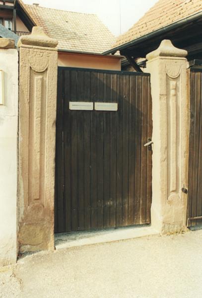 Logis en pan de bois sur soubassement en maçonnerie ; 1er étage en encorbellement sur le mur-gouttereau et le mur-pignon. Pan de bois avec liens pleins, chaise curule. Porte de cave rectangulaire sur le gouttereau, protégée par un auvent ancien, porté par des poteaux de bois. Le mur-pignon postérieur comporte une chaîne d'angle harpée jusqu'au toit. Gouttereau postérieur en maçonnerie et pan de bois. Porte piétonne à piédroits monolithes, sculptés, sommés de bulbes.