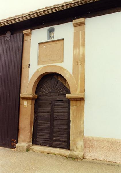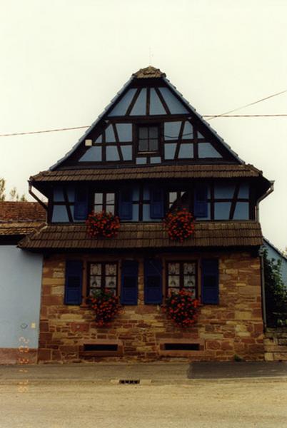 Logis en pan de bois, sauf le rez-de-chaussée du mur-pignon en moellons de grès. Fenêtres rectangulaires, à appuis saillants. Porte piétonne en plein cintre, avec impostes moulurées, piédroits se poursuivant jusqu'au sommet du mur de clôture ; panneau mouluré au-dessus de la porte, avec inscription. Porte charretière sous chaperon.