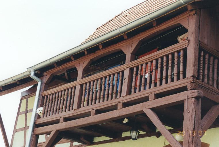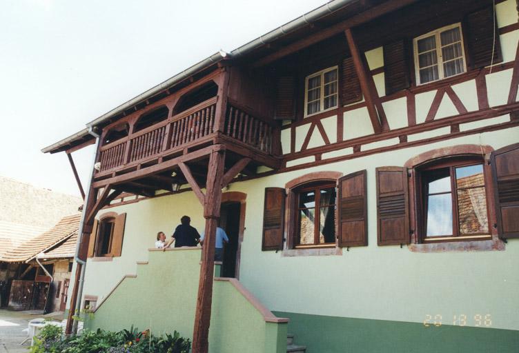Logis au rez-de-chaussée en maçonnerie et à l'étage en pan de bois. Sous-sol partiel avec une porte en plein cintre moulurée. Fenêtres en arc segmentaire. Motifs en chevron dans les allèges des fenêtres. Escalier d'accès au rez-de-chaussée restauré. Sur le mur-gouttereau, balcon en bois sur poteaux, à trois baies, couvert par l'avancée du toit. Garde-corps de balustres tournés. A l'intérieur, puits sans margelle dans la cave ; salle au rez-de-chaussée lambrissée, à solives moulurées ; alcôve avec deux portes de placard, une horloge à cadran peint, datée 1830 ; petite armoire d'angle. Petite salle au lambris orné de losanges. Dépendances : étable avec coursière au garde-corps de balustres tournés et cellier à la porte rectangulaire. Grange en maçonnerie et pan de bois au fond de la cour. Mur-pignon en pan de bois, avec motifs d'" hommes " et de losanges. Puits couvert dans la cour. A l'arrière de l'étable, source et lavoir maçonné. Porte piétonne en plein cintre (refaite) , surmontée d'une niche et porte charretière à glissière.