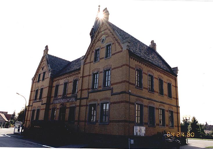 En briques de terre cuite non enduites panachant les couleurs rouge et jaune, cet édifice présente un plan en H. Le corps central, parallèle à la rue, est couvert d'une toiture à pans et un campanile octogonal positionné axialement naît de son faîtage. Deux ailes, à toiture à pans à l'arrière de pignons découverts, l'accostent perpendiculairement. Il comprend un sous-sol, un rez-de-chaussée surélevé avec perrons, un étage carré et un étage de comble. Côté rue le perron est à volées convergentes, côté cour il est à volée simple. Les pignons sont munis de rampants à crossettes galbées et d'éléments sommitaux redentés. Hormis les oculi trilobés occupant la pointe des pignons, les façades sont percées de baies à chambranles en grès surmontés d'arcs de décharges d'imitation en briques alternativement rouges et jaunes. Une table en grès, vierge d'inscription, prend place sur la face avant de l'aile centrale, au-dessus de l'entrée. Soubassement en moellons gréseux, chaînes d'angles, cordons, bandeaux et rives, en briques ou grès, tuiles en terre cuite plombifères noires, brunes et jaunes, girouette aux armes de la ville, animent les façades et rehaussent l'édifice.