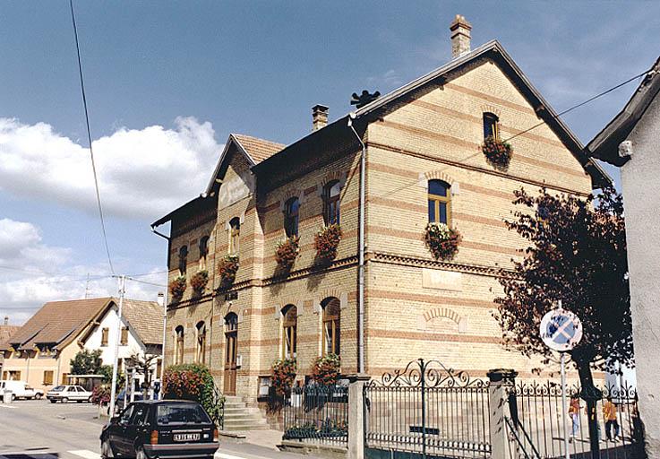 Sur le plan cadastral de 1829 la mairie ou maison commune paraît occuper une parcelle située au nord dans la rue du Moulin. On peut supposer sans trop d'invraisemblance que, comme l'église Saint-Osvald, elle a été détruite par l'incendie de 1891. La commune profita des circonstances pour l'implanter en bordure de la rue principale et en vis à vis de l'édifice cultuel. Comme l'indiquent les inscriptions figurant sur le fronton de la façade principale, cette mairie-école a été bâtie en 1892 par ou sous la direction de M. Baehrel, entrepreneur ou architecte à Erstein (GEMEINDE-U-SCHULHAUS / ERBAUT 1892 / M. BAEHREL, ERSTEIN).