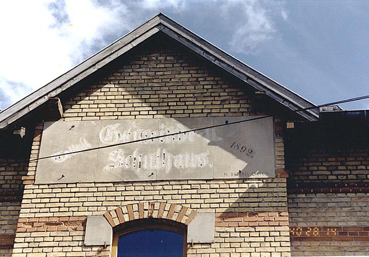 De plan quadrangulaire, l'édifice a été exécuté en briques non enduites de couleur rouge et de couleur jaune montées en lits alternés. Composé d'un sous-sol, d'un rez-de-chaussée surélevé, d'un étage carré, d'un comble à surcroît, il est couvert d'une toiture à longs pans débordants présentant, par sa situation en angle de rue, un gouttereau et un pignon au domaine public. Un avant-corps axial légèrement hors-oeuvre prend place sur la façade principale. Précédé d'un perron à volées convergentes en grès et rampe en fer forgé, il est couvert d'une toiture à petits pans. Dénuées de chambranles, les baies et portes disposent cependant de linteaux en arc segmentaire en briques rouges et jaunes prenant appui sur des sommiers en grès. Un soubassement en grès, des bandeaux en briques rouges soulignent les niveaux et contribuent à animer les façades. L'inscription indiquant la fonction de l'édifice, la date d'édification et l'auteur occupe la table composée de trois éléments en grès encastrés dans le haut du pignon de l'avant-corps.