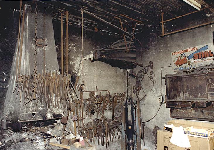 Adoptant un plan en L discontinu en bordure d'une cour ouverte, l'exploitation agricole se compose d'un logis, d'une étable, d'une grange et d'une forge. Le logis est mixte. Il dispose d'un sous-sol partiel et d'un rez-de-chaussée en maçonnerie enduite, d'un étage carré en pan de bois. Il se présente en pignon sur rue. Un toit à longs pans et demi-croupe le couvre. Les baies du rez-de-chaussée sont munies de chambranles en bois. Le pan de bois comporte des poteaux corniers épais et des sablières de plancher et de chambrée moulurées. En maçonnerie enduite la forge présente un plan rectangulaire. En rez-de-chaussée, elle est précédée d'un auvent sur poteau et un toit à longs pans, pignon tourné sur rue, la couvre. Percée de baies à chambranles en enduit d'imitation (?) , elle est desservie par une porte perçant le pignon principal et par une porte secondaire placée sur le mur gouttereau côté cour. L'intérieur du volume préservé par son ancien exploitant a conservé son foyer, sa hotte, ses soufflets, ses enclumes, une perceuse, divers marteaux mécaniques, une belle et importante série d'outils.