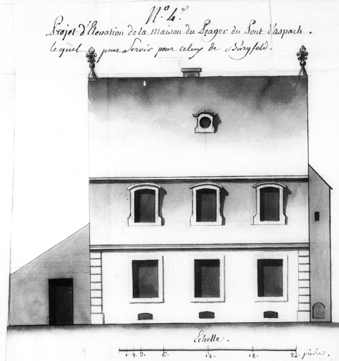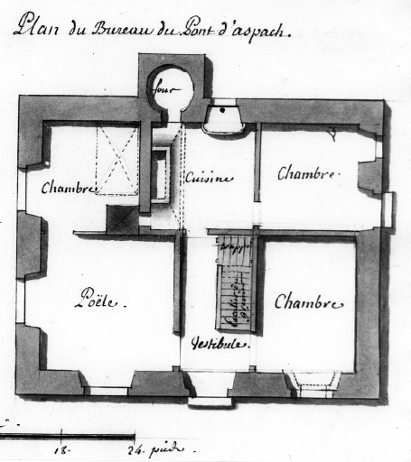 L'existence d'un pont sur la Doller à Burnhaupt-le-Haut est attestée en 784, 1289, 1545 et 1628 sous différents noms. C'est en 1860 qu'apparaît le nom actuel du lieu-dit " Pont d'Aspach ". Il s'agit d'un noeud routier de première importance où convergent les routes de Bâle-Altkirch, Mulhouse, Rouffach-Cernay-Thann, Masevaux, Belfort. Une réfection du pont est mentionnée en 1570. Il a été reconstruit en maçonnerie au milieu du 18e siècle. Autour de ce pont s'élève un hameau, avec une chapelle (édifiée au début du 18e siècle par Apollinaire Bisch) et un octroi. L'autorité royale projette d'agrandir cet octroi d'après des plans de Jean-Baptiste Chassain en 1757-1758 : modification de la distribution intérieure, surélévation d'un étage. Le site a été rasé pendant la première guerre mondiale.