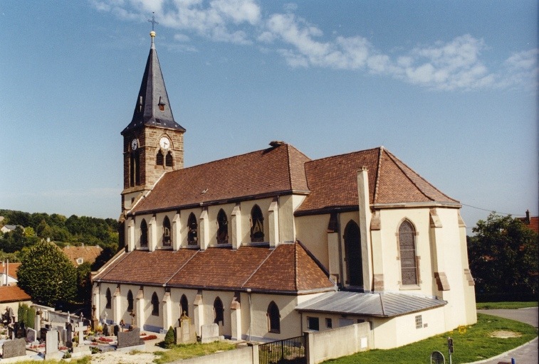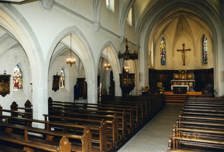 Eglise non orientée, de plan allongé, de style néogothique. L'édifice reprend dans son ensemble le parti de l'église détruite en 1875. La nef, bordée de collatéraux, se déploie sur cinq travées. Chaque travée est couverte d'une voûte d'ogives quadripartite. Le choeur, à pans coupés, donne accès aux sacristies latérales, qui prolongent les bas-côtés. La tour- porche se distingue par un portail en arc brisé surmonté d'une rosace. Le clocher à claire-voie est couvert d'une flèche octogonale à égout retroussé de plan carré. Chaque baie est composée de deux lancettes surmontées d'une horloge. Des contreforts peu saillants scandent la majorité des façades.