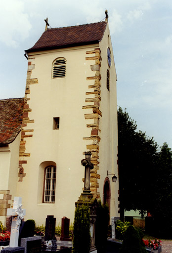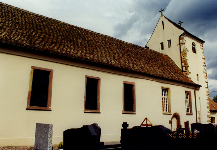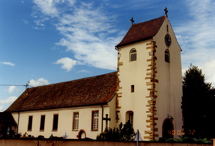 Une église à nef unique fut construite à l'époque romane probablement au milieu du 12e siècle. Il subsiste, semble t-il une partie de sa nef (angle sud-est) ainsi que les piédroits de l'arc triomphal. Au 13e ou 14e siècle, la tour fut apparemment rebâtie, avec un rez-de-chaussée voûté qui servait de choeur, et à l'extérieur des chaînages d'angle à bossage. L'arc triomphal fut alors surhaussé (avec remploi des claveaux anciens) et doublé vers l'ouest. Tous ces éléments subsistent encore, mais il semblerait qu'une nouvelle voûte aurait été posée dans le choeur au 15e ou 16e siècle. Des traces d'une ancienne toiture de la nef restent visibles depuis les combles. A un moment indéterminé, on renforça l'angle nord-est du clocher. La guerre de Trente ans causa en 1638 la ruine de l'édifice. Il n'en restait que la tour et la partie est de la nef. Les grandes baies à meneau de la nef pourraient remonter aux réparations qui s'ensuivirent. En 1844, le rez-de-chaussée de la tour fut transformé en porche, tandis que la nef était allongée vers l'ouest et, du même côté, pourvue d'un choeur avec abside. Les plans sont dus à l'architecte Joseph Laubser de Neuf-Brisach. Les travaux furent exécutés par l'entrepreneur Pfad d'Artzenheim. En 1862, une nouvelle chambre des cloches fut montée par le charpentier Georges Pfeffer sur des plans de Laubser. En 1900, furent découvertes des peintures monumentales sur les murs intérieurs de la partie médiévale de la nef : un Jugement Dernier du 16e siècle et un saint Christophe qui serait plus ancien. Ces peintures étaient en mauvais état, et, quoique bénéficiant d'une protection des Monuments Historiques, ont été recouvertes d'enduit lors de la restauration complète de l'édifice en 1978/79. A cette occasion ont été mis en valeur les chaînages d'angle et le chambranle en plein cintre, dans l'élévation sud, d'un portail latéral de la nef. Ancienne filiale d'Artzenheim, l'église a accédé au titre de paroisse en 1920.