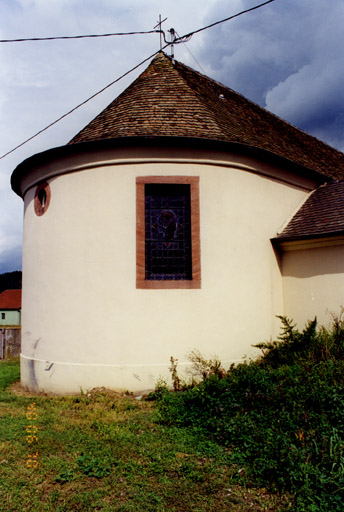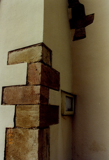 Les chaînes d'angle côté sud de la tour contiennent quatre reliefs romans (étudiés en objets). On y relève aussi la présence de certaines pierres noires (basalte ?) provenant du Kayserstuhl tout proche en Allemagne. Le rez-de-chaussée de la tour est voûté d'ogives, taillées en pierre noire, qui se perdent dans les angles. L'ancien arc triomphal repose sur des pilastres à imposte mouluré. Sur le piédroit sud se lit le nom " Lancili " sculpté en caractères du 12e siècle. L'ancienne partie de la nef est percée de deux fenêtres rectangulaires chanfreinées dont les meneaux centraux ont été retirés. A l'intérieur, on observe, des deux côtés, un décrochement qui indique vraisemblablement la jonction entre l'ancienne et la nouvelle nef.