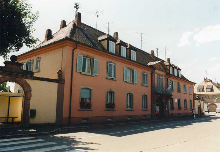 Bâtiment rectangulaire gouttereau sur rue, avec de part et d'autre un portail d'entrée dans la cour, en plein cintre avec amortissements à boules. En façade, léger avant-corps central avec fronton encadré de pilastres à refends. Porte en arc surbaissé surmonté d'un balcon sur consoles sculptées et corps de garde en fer forgé.