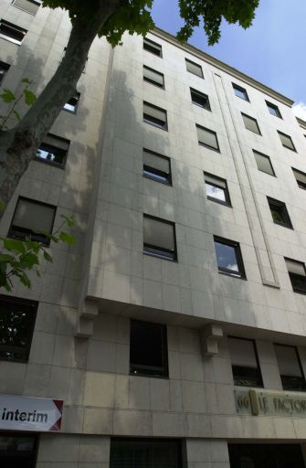 Avant-corps en encorbellement. Garages sous l'immeuble accessible par la rue Seguin. Jardin à l'arrière.