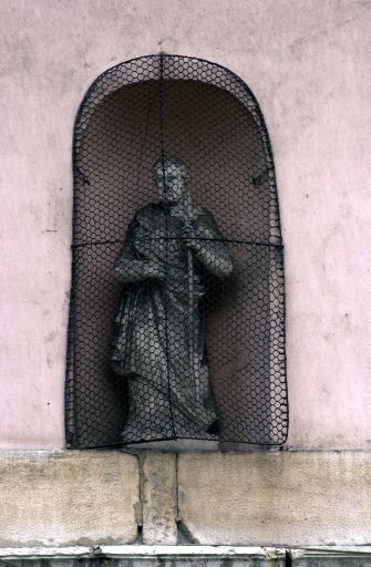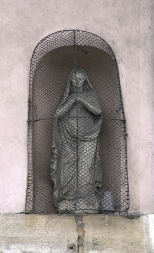 Deux statues (de la Vierge et de saint Joseph) ornent les niches de façade. La rampe d'escalier est en fer forgé à motifs de crossettes.