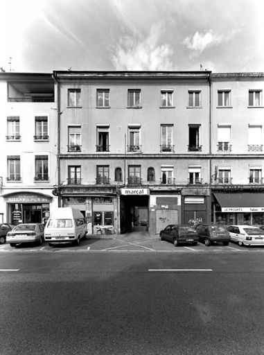 Le rez-de-chaussée de l'immeuble est occupé par des boutiques ponctuées de pilastres monolithes, avec vestiges de devantures en menuiserie. L'entrée se fait par un passage cocher menant à la cour sous lequel ouvre, à droite, la cage d'escalier autrefois ouverte sur la cour et aujourd'hui occultée. L'escalier présente un mur d'échiffre ouvert. A chaque étage, des couloirs longitudinaux desservent les logements.