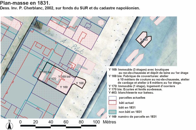 En 1827, le fabricant de couvertures Laurent Régny est assujetti à faire démolir un immeuble construit sans autorisation et à le reconstruire dans les 3 ans selon un plan accepté par la municipalité. En 1831, l'ensemble comprend un immeuble sur rue de 3 étages avec boutique au rez-de-chaussée et dépôt de laine au dessus (au sud du corps de passage) , et une fabrique de couvertures sur 2 étages (en grande partie détruite) au nord du corps de passage. En 1882, la fabrique fonctionne toujours, tenue par Benoît Josserand, fabricant à métiers, rue Ferrandière. Ce n'est qu'à la fin du 19e siècle que l'alignement sur le quai sera réalisé. La partie nord-ouest de l'immeuble a été en partie reconstruite, probablement au début du 20e siècle : un bâtiment en pan-de-bois, plus bas, est adossé à la façade postérieure, avec des coursières distribuant les logements. En 1969, l'immeuble sur rue est occupé par un hôtel garni, l'hôtel du Cheval Blanc.