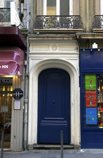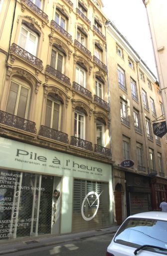 Immeuble construit sur l'emplacement de trois autres : la demande d'alignement est déposée le 29 octobre 1853 et autorisée le 11 novembre suivant pour Pierre François Tavernier et Etienne Vindry ; l'édifice est terminé en 1855. Architecte : Claude Anthelme Benoît. La porte remploie un vantail du 18e siècle.