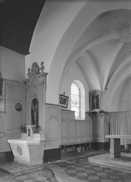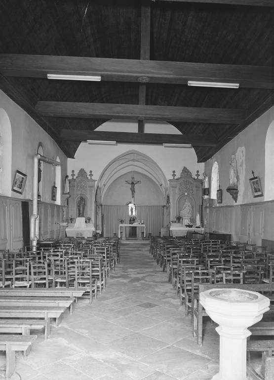 La nef est couverte d'une charpente lambrissée en plein-cintre, la travée droite du choeur, sous clocher, d'une voûte d'ogives à pénétrations et l'abside d'un cul-de-four. Une cage d'escalier permet d'accéder à l'escalier métallique qui conduit au clocher ; elle est en partie construite devant une ouverture basse en plein-cintre murée. Le clocher est en moellons, sauf la chambre des cloches où ils se mêlent à la brique. Le beffroi repose sur des corbeaux de pierre.