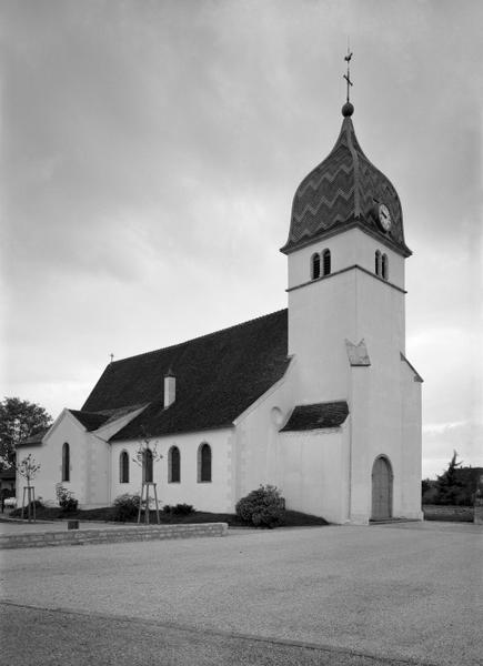 L'église est située au centre du village, dans l'enclos de l'ancien cimetière. Elle est essentiellement bâtie en brique, sauf quelques assises supérieures des murs des combles et une partie remaniée du clocher côté nef. Elle se compose d'un clocher hors-oeuvre en façade, d'une nef à trois vaisseaux et d'un choeur à deux travées flanqué, à gauche d'une chapelle et de la sacristie, à droite, d'une chapelle de même longueur que le choeur. Le vestibule est encadré par les arcs brisés qui supportent le clocher ; ce dernier est épaulé en façade par deux contreforts angulaires et deux petites constructions latérales lui sont adossées, celle de gauche abrite l'escalier. La chambre des cloches est percée sur les quatre faces de baies jumelées en plein-cintre. La nef comporte un vaisseau central, couvert d'une fausse voûte en berceau (anciennement en lattis et refaite en lattes d'aluminium enduites) reposant sur un entablement porté par des piliers octogonaux, et deux bas-côtés plafonnés, éclairés par des fenêtres en plein-cintre. Le choeur, couvert de voûtes d'ogives retombant sur des culots ornés d'écus lisses, est éclairé par une grande fenêtre axiale à remplages ; il communique avec les chapelles latérales par des ouvertures en plein-cintre, avec la sacristie par une porte rectangulaire. Le chevet est épaulé par deux contreforts angulaires, les murs latéraux par des contreforts au droit de l'arc-doubleau et de l'arcade du choeur, ceux-ci étant visibles dans la chapelle droite et pris dans les murs de la chapelle gauche. Cette dernière, éclairée par une fenêtre plus haute et plus étroite que les autres, est couverte d'une voûte d'ogive sur culots. La chapelle droite, plafonnée, présente à l'extérieur une porte latérale et une niche à encadrements en accolade, éléments provenant de l'ancienne église. Depuis les combles des bas-côtés, on peut voir dans les murs de la nef des ouvertures semi-circulaires murées. Le mur du choeur, visible dans le comble de la chapelle droite, présente une corniche formée de deux rangs de modillons séparés par une assise en dents-de-scie, un cadran solaire gravé dans la brique et le chaperon en pierre de taille d'un contrefort. L'édifice, couronné de corniches de types divers, est couvert d'un toit à longs pans sur la nef et le choeur, d'un toit à deux pans sur la chapelle gauche, d'appentis sur la chapelle droite, la sacristie et les petits corps encadrant le vestibule ; ces toitures sont en tuile plate, sauf celle de la sacristie en tuile creuse. Le toit à l'impériale du clocher est en tuiles polychromes vernissées en écaille.