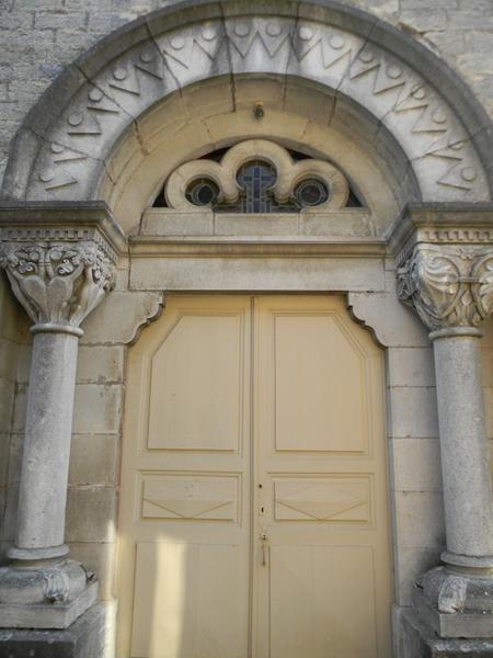 Eglise de plan en croix latine édifiée en moellons de pierre apparents avec chaînes d'angle en pierre de taille. Toits à longs-pans ou en pavillon couverts de tuiles plates, de tuiles mécaniques ou d'ardoises. Portail percé d'une baie en plein-cintre avec porte d'entrée à deux vantaux. Tympan en plein-cintre à réseau, colonnes surmontées de chapiteaux sculptés. Baies en plein-cintre au dessus de la porte d'entrée avec colonnes surmontées de chapiteaux. Tours carrées avec fronton triangulaire de part et d'autre du portail. Baies en plein-cintre. Nef comprenant trois travées et des contreforts. Baies en arc brisé. Baies en arc brisé. Chevet comprenant une tour-clocher avec baies en arc brisé, en plein-cintre et horloge.