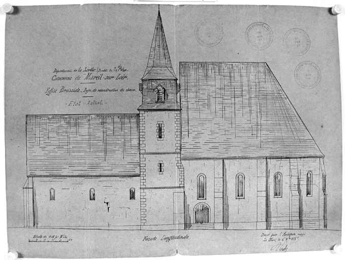 la plus ancienne mention de l'édifice remonte à 1123. Du XIIe siècle, l'église conserve peut-être la base de son clocher-tour qui fut en grande partie reconstruit en 1667-1668 par le maître maçon fléchois Urbain Landais. Après un projet en 1849 de restauration non suivi d'exécution par l'architecte jésuite le père Tournesac, la nef et le choeur furent détruits et remplacés par l'édifice actuel entre 1885 et 1894 sous la direction de l'architecte manceau Pascal Vérité.