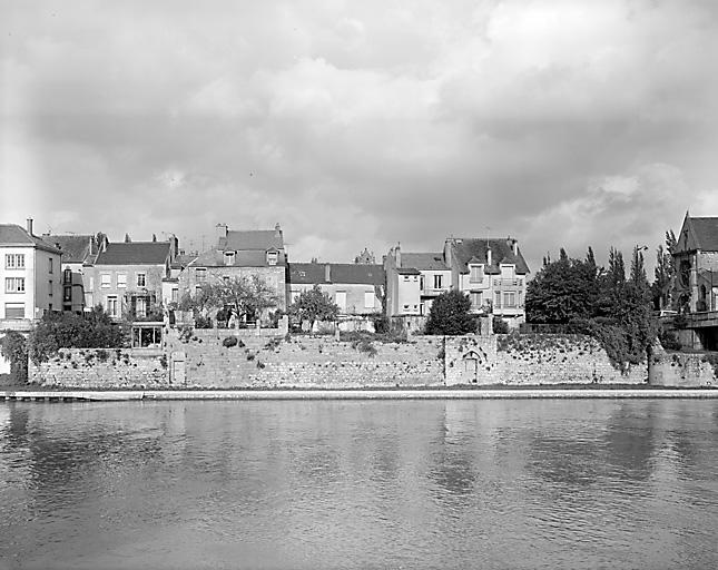 Le rempart du Bas-Empire, autour de l'île Saint-Etienne, est une fortification en pierre de petit appareil et brique, qui réutilise dans ses fondations des blocs de grand appareil provenant de la parure monumentale de l'agglomération du Haut Empire. Les fortifications du 13e siècle sont des murs en calcaire, hauts de 6 à 7 mètres et épais de 2 mètres. Sur l'île, cette enceinte comprend deux portes flanquées de tourelles, implantées dans l'axe de la Grande rue (auj. rue Saint-Etienne) pour contrôler les ponts. Sur les deux rives de la Seine, les remparts sont flanqués de tours cylindriques et carrées, et percés de sept portes à tourelles : trois sur la rive sud, quatre sur la rive droite. Ce dispositif est complété à la fin du 16e siècle par des éperons au nord (porte des Carmes) et au sud (porte de Bière) , ainsi que sur l'île ("fort de l'Hirondelle").