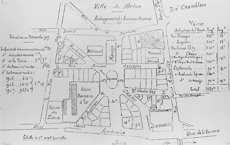 A partir de 1905, le quartier de cavalerie de la rive sud étant désaffecté (voir dossier IA77000437) , la Ville de Melun projette à son emplacement une vaste opération de lotissement. La plupart des bâtiments de l'armée sont promis à démolition. Ces travaux de démolition sont adjugés en avril et mai 1905, et en octobre 1906, on adjuge les travaux de terrassement. Le découpage des lots est mené par Padrona, voyer-conseil de la ville. Le plan des nouvelles voies à percer est approuvé par arrêté préfectoral le 31 octobre 1907. Les premiers lots sont vendus dès 1905-1906, mais la plupart des achats sont effectués de 1908 à 1910. L'opération comprend également des équipements publics, pris en charge par la Ville : aménagement d'une salle des fêtes dans l'ancien manège de cavalerie (dossier IA77000439) , construction d'une école rue Armand-Cassagne (cf. sous-dossiers) , installation d'une bibliothèque publique dans un ancien bâtiment militaire rue Armand-Cassagne (finalement détruit). Cette opération rencontre un franc succès, presque tous les lots étant déjà bâtis lorsque se déclenche la Première guerre mondiale. Le lotissement fournit donc un bel échantillon d'architecture des années 1910, où se rencontrent des architectes locaux (Victor Baustert, G. Cabaret) et parisiens (Emile Poignant, Alexandre Trappier) , ainsi que des entrepreneurs comme Véron fils.