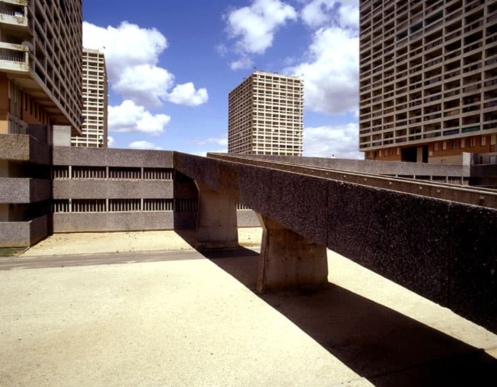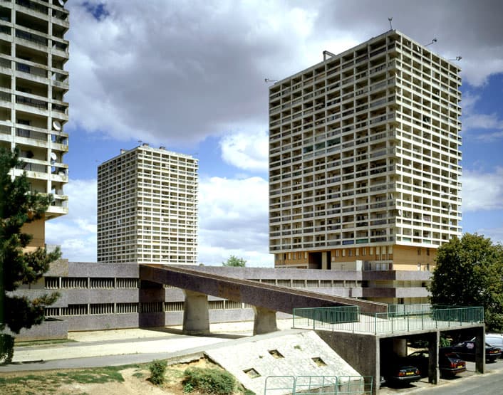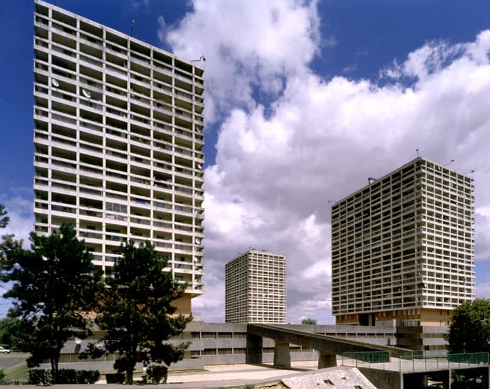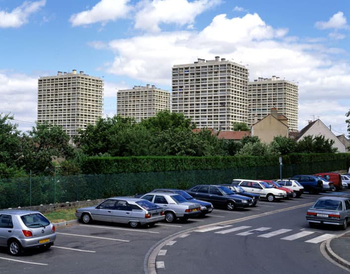 grand ensemble ; église ; groupe scolaire ; stade ; château d'eau ; chaufferie