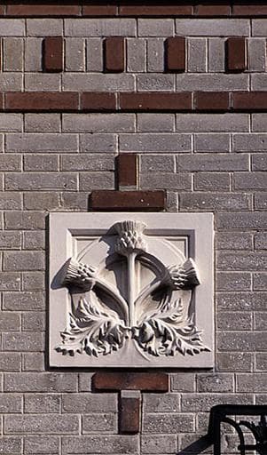 L'immeuble présente sur la rue Saint-Ambroise une façade à parement de briques blanches, ornée d'un décor soigné : motifs géométriques en briques rouges, carreaux de céramique blanche représentant des chardons et éléments sculptés pour la corniche à modillons et les allèges des fenêtres. Les lucarnes retroussées, dont cet immeuble constitue la seule occurrence repérée à Melun, contribuent à l'originalité de l'édifice. A l'intérieur, le vestibule est orné de toiles marouflées signées Gaston Heller.
