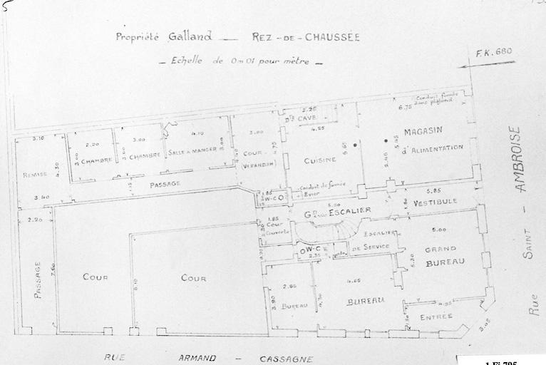 Cet immeuble a été réalisé pour M. Galland, sur un terrain acheté en 1909. Les ferronneries de la porte d'entrée sont d'ailleurs ornées de deux "G" affrontés. Sa situation d'angle est intéressante pour illustrer la hiérarchie des rues nouvelles par rapport aux rues préexistantes : la rue Saint-Ambroise garde son rang d'artère principale, sur laquelle ouvre l'avant-corps central en saillie.
