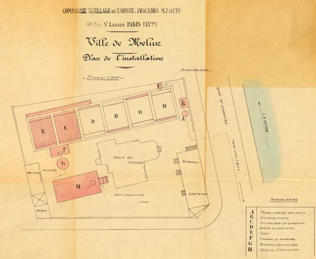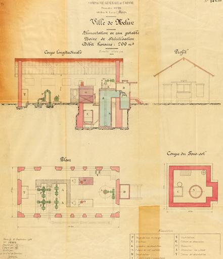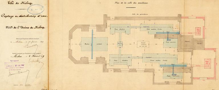 Jusqu'au milieu du 19e siècle, les habitants de Melun doivent aller puiser l'eau au puits, à la fontaine ou au fleuve. Le 13 avril 1859 est fondée une société pour l'alimentation de la ville en eau courante. Celle-ci fait construire une usine pour puiser l'eau de la Seine. Cet établissement, installé sur la rive sud du fleuve, au voisinage du quartier de cavalerie, est inauguré en 1860. Des châteaux d'eau sont édifiés sur le plateau nord, en bordure de la route de Meaux. Le concessionnaire de l'usine est Coiret, qui dirige d'autres établissements de même type à Cambrai, Meaux et Choisy-le-Roi. L'usine des eaux reste en activité jusqu'au captage de l'eau de la Glandée, au 20e siècle.