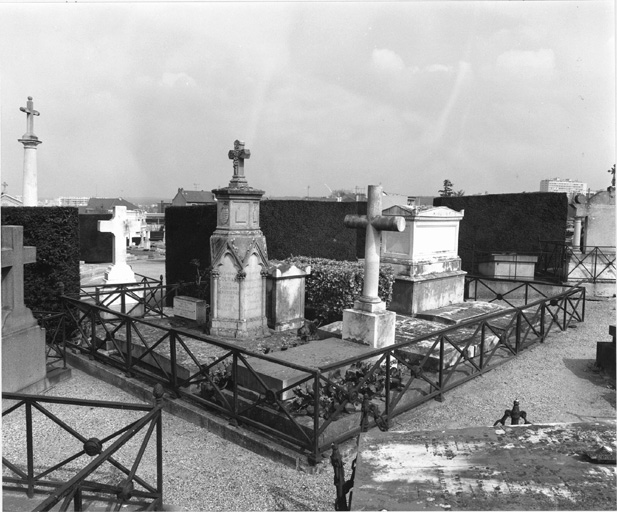 Enclos funéraire délimité par une balustrade de fonte est constitué de plusieurs tombes de typologies différentes : un édicule octogonal de style néogothique, sépulture de Lorenzo Courant, ancien maire de Poissy, 1892 et de son épouse née Catherine Schlumberger, 1909, tombeaux avec sarcophage à l'antique dont l'un de la famille Gros, 1845, de simples dalles funéraires dont l'une avec croix. L'édicule octogonal est signé du marbrier Libersalle.