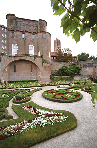 Dessiné pour le premier archevêque d'Albi (Hyacinthe Serroni) qui fit transformer le palais épiscopal pour y installer terrasse, contre-terrasse et jardin à la française entre 1678 et 1687. Il est le résultat de la transformation d'un lieu qui, à l'origine, avait une vocation militaire : chemin de ronde transformé en promenoir après arasement des remparts, adjonction de statues sur les quatre belvédères en feston aménagés à l'emplacement des contreforts demi-circulaires de la muraille. Dessin des broderies de buis rétabli par l'architecte de la ville au début du 20e siècle, affirmant, à la suite des frères Duchesne, le retour au jardin régulier alors dit "à la française".£A noter : dans le palais épiscopal, des lambris d'appui peints de scènes architecturées du 17e siècle avec des représentations de jardins.
