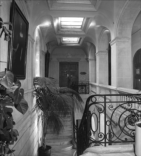 Tour à quatre étage. Hall d'entrée couvert de fausses voûtes déprimées reposant sur huit colonnes. Cage d'escalier couverte d'une voûte déprimée percée de trois verrières. Au premier étage le couloir de desserte des différentes pièces donne sur la cage d'escalier par trois arcs en anse de panier reposant sur des piles. Chapelle voûtée d'une travée d'ogives moulurées retombant sur des colonnettes d'angles. Choeur voûté en cul-de-four..£partie centrale de la façade antérieure en loggia.
