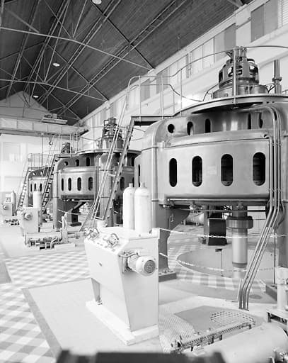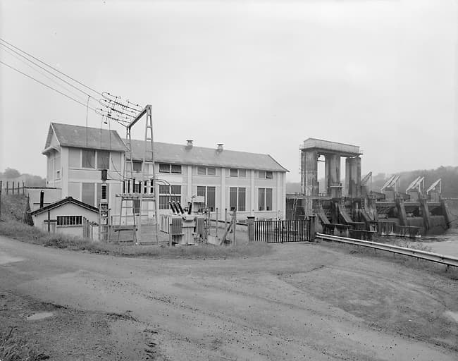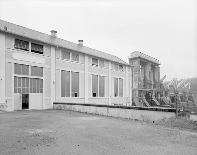 barrage ; salle des machines ; transformateur (abri) ; atelier de réparation