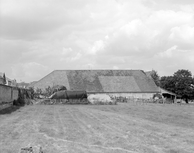 Le bâtiment forme un quadrilatère de 47, 30 m de long sur 19, 90 m de large. Le pignon est, sur le parc, est percé de deux oeils-de-boeuf et comporte trois contre-forts couverts de tuiles, tandis qu'à l'ouest le pignon est dans le prolongement du corps de ferme perpendiculaire à la grange. Le dessin des tuiles fait apparaître une croix au centre du pan nord de la toiture. La disposition intérieure comprend une nef centrale et deux bas-côtés. La largeur de la nef est de 9 m, celle des bas-côtés de 4, 5 m. Nef et bas-côtés sont délimités par deux alignements de 10 piliers chacun, 12 piliers en pierres, carrés, et 8 poteaux de chêne sur des socles en pierre.