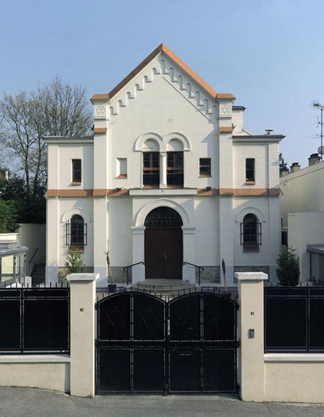 La façade est ornée sur son pignon central d'un motif simplifié de lésène et de deux étoiles de David ammortissant les pilastres latéraux. Le caractère néoroman du parti décoratif adopté par l'architecte est également présent dan la présence des baies géminées cintrées séparées par une colonne. Sur les baies latérales du rez de chaussée les feronneries représentent des chandeliers, évocation de lithurgie juive.