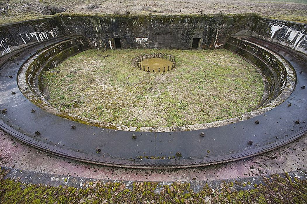 Emplacement d'une pièce d'artillerie allemande à longue portée, visant Reims et Châlons-sur-Marne pendant la Première Guerre mondiale. L'emplacement comporte une plate-forme circulaire construite en béton armé, une rampe de chargement des obus et des salles souterraines servant au stockage des munitions et d'abris