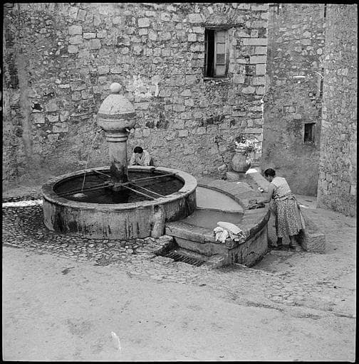 Place avec sa fontaine, son dallage en cailloux, la loge à colonnes à gauche et la façade de l'ancien palais des consuls à droite : inscription par arrêté du 30 septembre 1942
