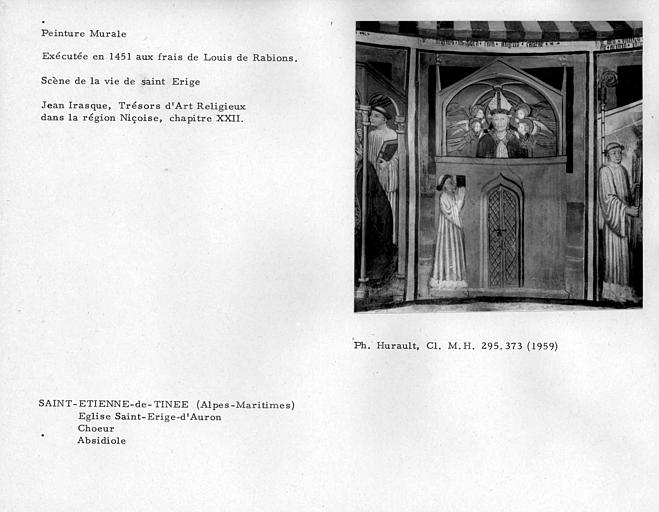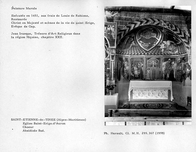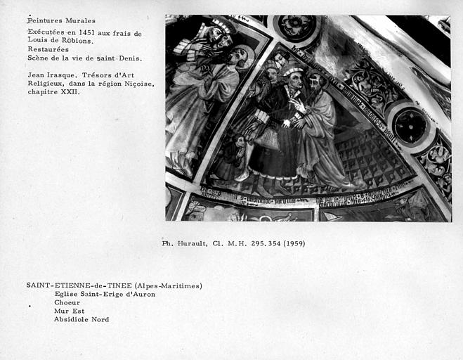 Construite au 13e siècle ou dans la première moitié du siècle suivant, la chapelle actuelle fut enrichie en 1451 d'un somptueux décor peint, dont la date et le commanditaire nous sont révélés par une inscription, mais dont l'artiste, sans doute piémontais, demeure anonyme. Ces peintures à la détrempe recouvrent un décor plus ancien, dont subsistent des vestiges. La chapelle comporte une large nef à charpente apparente, prolongée par deux absides inégales voûtées en cul-de-four et flanquée au sud par un clocher à flèche de pierre probablement plus tardif et par un bâtiment perpendiculaire ajouté au milieu du 16e siècle, l'ancien presbytère. Le décor occupe les deux absides, la niche centrale surmontée d'un baldaquin, le mur oriental de la nef et une partie du mur latéral nord. Les thèmes traités sont : l'histoire de Saint-Erige, le Christ entouré du Tétramorphe, l'histoire de Saint-Denis, l'histoire de Marie-Madeleine, ainsi que des saints, des apôtres, ...