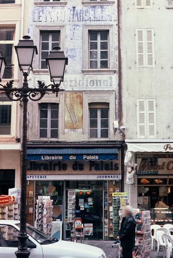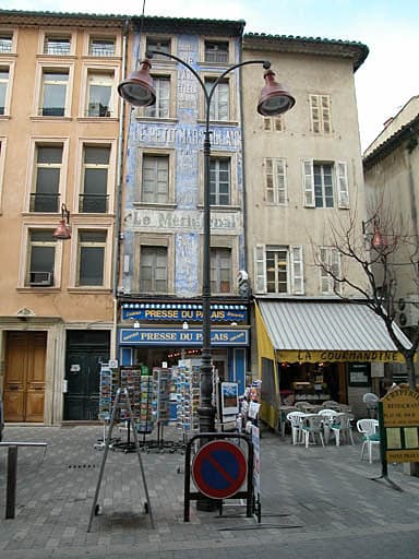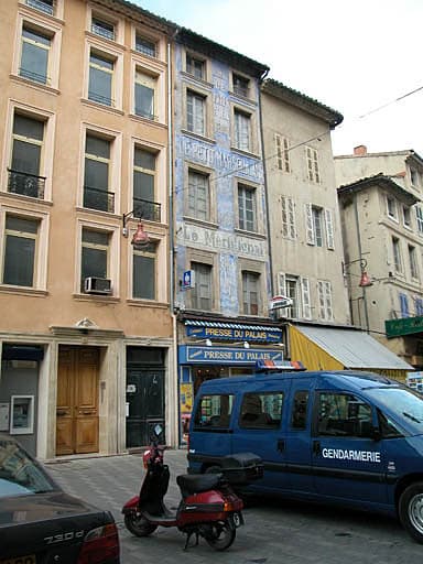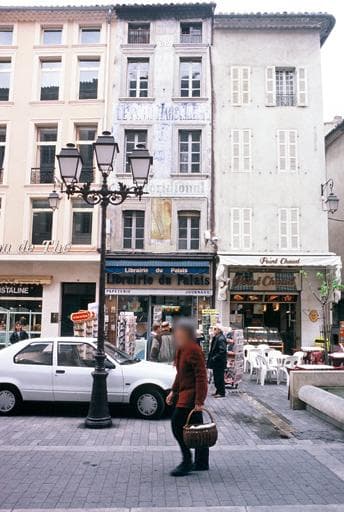 Cet immeuble de la fin du 18e siècle, qui fait face au Palais de Justice, possède une façade entièrement recouverte d'enseignes publicitaires peintes concernant la presse : "Journaux de Paris et de la région" (vers 1920), 'le Petit Marseillais", "Le Méridional" (vers 1960), "Jif Watermann", ...