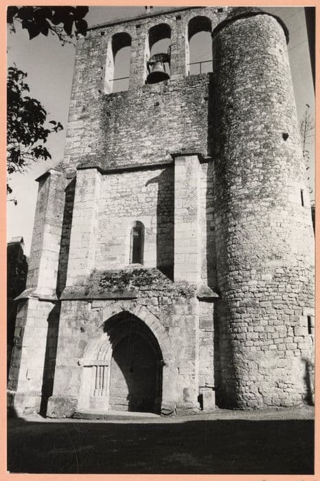 Cette église dépendait, au 13e siècle, de l'archiprêtré de Paleyrac et avait pour collateur la collégiale de Saint-Cyprien. En 1439, le sire de Turenne met le siège devant Allas, tenu par les Anglais, et le remet sous la dépendance française. L'édifice présente une nef à trois travées voûtées d'arêtes et un choeur. La troisième travée fait office de transept par l'adjonction de deux chapelles qui s'ouvrent par de grands arcs en plein cintre portés sur des pilastres. Le choeur, dont l'arc triomphal en plein cintre retombe sur des piles semblables à celles de la nef, est voûté d'un cul de four. £Sur la façade ouest partagée en trois registres par des plates bandes, le portail comporte trois archivoltes en tiers point retombant sur un bandeau sculpté qui se poursuit sur toute la profondeur du portail, faisant office de chapiteau. Les archivoltes sont prolongées par de petites colonnettes à bases sculptées. Le second registre comporte deux contreforts qui prolongent les piédroits du portail et entre lesquels s'ouvre une baie en plein cintre. Le troisième registre est formé par le clocher-mur rectiligne, percé de trois baies campanaires. £Cette façade est accostée au sud-ouest par une tourelle d'escalier cylindrique percée de meurtrières et ornée, au sud, d'une tête féminine. Sous la plate-bande du troisième registre sont sculptés deux écussons, l'un représentant trois quadrupèdes, l'autre deux quadrupèdes et une tête de bovidé.