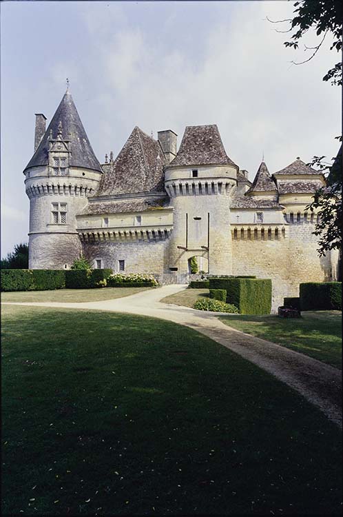Aucune mention du château n'apparaît avant le 14e siècle. Pris et ruiné en 1442, au cours d'un épisode de la guerre de Cent, il fut reconstruit par Brandelis de Gontaud-Biron, aidé de son frère Armand de Contaud, évêque de Sarlat. Les travaux se déroulèrent de 1510 à 1515. Son décor intérieur est en grande partie conservé : escaliers, nombreuses cheminées, fresques... C'est l'un des châteaux de la Renaissance les plus célèbres du Périgord.££Une vaste barbacane dérasée commande l'approche de la forteresse, dont l'accès se fait par un pont-levis et un châtelet, en avant d'une courtine couronnée par un chemin de ronde sur mâchicoulis. La cour intérieure s'inscrit au milieu de pavillons dissymétriques, compénétrés par des tours rondes et des tourelles d'escalier. La tour dite de Henri IV conserve un décor peint. Un pigeonnier circulaire du 18e siècle est situé en contrebas du château.