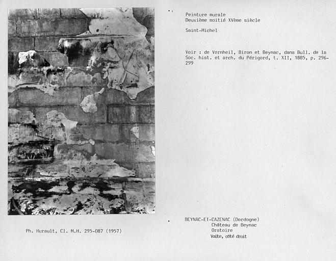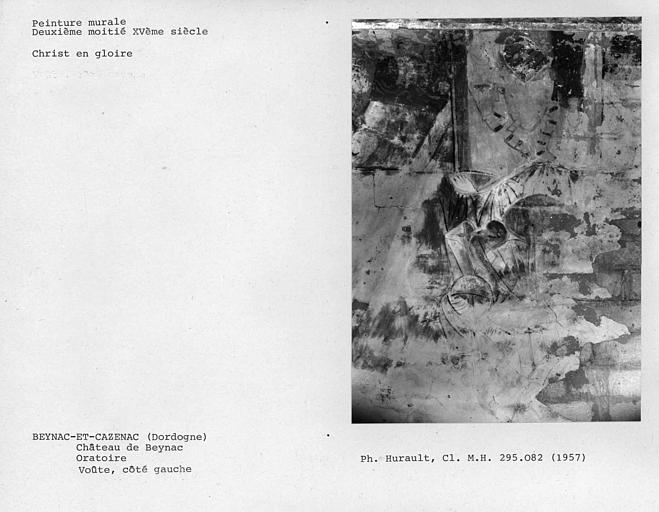 Le lieu a dû être occupé par une place-forte dès le haut Moyen-Age. A la fin du 11e siècle, l'existence des seigneurs de Beynac est attestée. Au début du 12e siècle, Simon de Montfort, chef de la croisade contre les Albigeois, fit détruire les murs et la tour du château. En 1238, la seigneurie de Beynac devient fief du comte de Toulouse. Par le traité de Brétigny, Beynac passa sous domination anglaise. En 1368, Beynac se rangea aux côtés de Charles V et entra en lutte contre les Anglais. ££Le château a conservé extérieurement toutes ses dispositions médiévales. Il se présente au bord du roc surplombant la Dordogne, en un vaste quadrilatère irrégulier. A l'angle nord-ouest se trouve le donjon carré, couronné de créneaux et flanqué d'une tourelle contenant l'escalier. Il est relié par un mur de courtine à mâchicoulis à une tour et au bastion méridional qui flanquait les faces ouest et sud. Ce bastion est couronné par un crénelage et deux tourelles cylindriques sur ses angles. Sur les faces sud et est du château se développent les corps de logis, remaniés au 16e siècle. Une tourelle en encorbellement a été ajoutée au 16e siècle. La face nord du château est fermée par un mur de courtine crénelé, renforcé à un angle saillant par une tourelle en encorbellement. A l'intérieur du château, une courette placée au centre éclaire les deux escaliers dont l'un dessert le donjon et les salles de défense ; l'autre, construit au 17e siècle, conduit aux appartements. Deux pièces décorées au 17e siècle présentent un décor d'entrelac et de rinceau sur les poutres et les boiseries, ainsi que des peintures. Aux abords du château se trouvent la poterne, les tourelles de défense, les bâtiments de communs se reliant avec les terrasses et l'église.££Sous le château se trouve un édifice auquel certains attribuent le rôle d'abbaye ou de prieuré. D'autres y voient l'ancien "présidial", qui s'élevait à mi-chemin du village et du château, ce qui semblerait plus plausible étant donné que cet édifice ne comporte que deux salles. C'est un bâtiment rectangulaire de deux étages sur rez-de-chaussée. L'entrée se fait sur la face ouest par une porte à linteau droit qui donne sur une pièce où s'élevait l'escalier conduisant aux étages. Les deux niveaux semblent n'avoir comporté qu'une grande salle chacun. Si le rez-de-chaussée et le premier étage ont leurs murs intérieurs en petit appareil plus ou moins régulier, le second étage en présente un régulier et bien assisé, qui tendrait à en faire une pièce d'apparât.