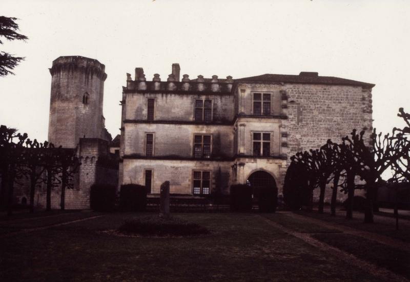 Les seigneurs de Bourdeille sont cités parmi les compagnons de Charlemagne. Il ne reste rien des constructions qui pouvaient exister à cette époque, et les parties les plus anciennes du château actuel ne remontent pas au-delà du début du 14e siècle. Elles sont attribuées à Hélie VII de Bourdeille, qui les aurait faites édifier en 1303. L'enceinte renferme également une habitation Renaissance construite à la fin du 16e siècle (1585 ou 1589) par la marquise de Bourdeille qui en dressa elle-même les plans. ££Du château fort subsistent les quatre murs d'un bâtiment à deux étages, autrefois divisé en deux grandes pièces par un mur de refend ; des jambages de cheminée ; les naissances d'une voûte d'arête ; de larges baies géminées. Le donjon octogonal est couronné de mâchicoulis. Un escalier circulaire ménagé dans une tourelle engagée sur l'une des faces, donne accès à quatre étages de salles voûtées. Les restes importants du mur d'enceinte, couronnés de mâchicoulis, et la porte d'entrée qui s'ouvre entre deux grosses tours rondes, complètent la partie médiévale. La construction Renaissance est restée inachevée et son unique pavillon carré devait être relié à une autre corps de bâtiment semblable, par une galerie. L'intérieur a conservé des restes de décoration : arabesques dorées des plafonds, lambris décorés de paysages en camaïeu, cheminées monumentales...