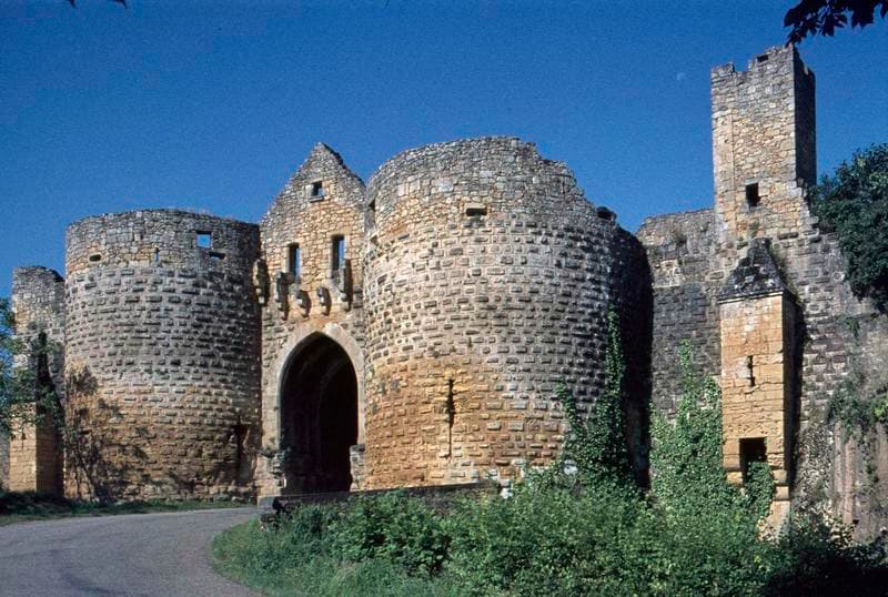 Au 13e siècle, la Guyenne et l'Agenais étant aux mains anglaises, le roi de France s'établit à Domme pour se défendre de ce voisinage. Une bastide royale fut créée et fortifiée. En 1347, le mont de Domme fut pris par les Anglais, mais repris l'année suivante par le sénéchal de Périgord. Le traité de Brétigny plaça cette forteresse sous suzeraineté anglaise, mais elle repoussa les attaques de 1370 à 1384. En 1417, Domme fut à nouveau occupée par les Anglais jusqu'en 1438. Pendant les guerres de Religion, Huguenots et Ligueurs prirent tour à tour la forteresse qui resta finalement aux Protestants jusqu'en 1592. ££Les remparts sont percés de trois portes : porte del Bos, porte de la Coumbo et porte des Tours. Bâtie en 1381 comme le reste de l'enceinte, cette dernière faisait pendant au double château qui couronnait la partie ouest. La porte est encadrée de deux tours massives, formée d'une longue voûte ogivale au sommet de laquelle deux ouvertures permettaient le passage des herses. Derrière chaque herse était une porte en bois qui se fermait par un système de ferrures et de poutres. Dans l'intervalle de ces deux portes, deux meurtrières en croix permettaient de défendre le passage. Une troisième est située dans la voûte. Des deux côtés des tours, une sorte de guérite fait saillie, servant de latrines à la garnison. Les chemins de ronde des plateformes permettent de passer d'une tour à l'autre, et datent probablement du 16e siècle, réalisés au cours des guerres de Religion.