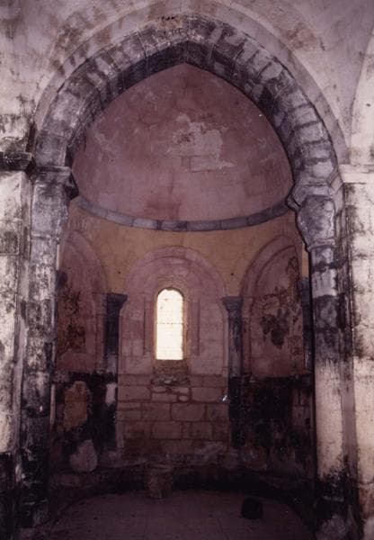 Eglise romane s'ouvrant par un porche à trois arcades surmontées d'un entablement sur lequel reposent cinq arcades. Chaque arcade est soutenue par trois colonnettes à chapiteaux sculptés de personnages et animaux. La nef a été surbaissée depuis la suppression de la voûte primitive, remplacée par une voûte en bois. Clocher sous coupole. Le choeur est orné de quatre gros piliers granit à chapiteaux sculptés.
