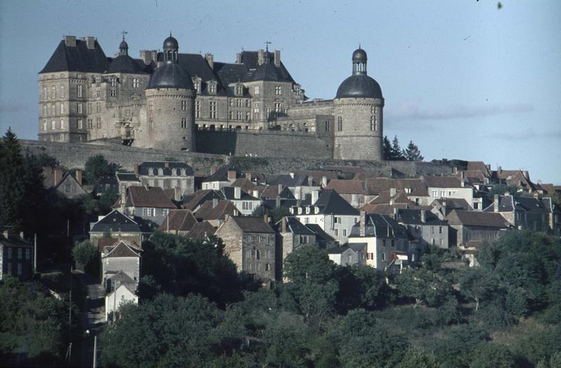 Au 12e siècle, le troubadour Bertrand de Born possédait le vicomté d'Hautefort. Il joua un rôle important dans la guerre entre Richard Coeur de Lion et Henri Court-Martel, prenant parti pour ce dernier. A la mort de Court-Martel, en 1183, un siège de huit jours aboutit à la prise du château par le roi anglais. Born put conserver sa seigneurie et rebâtit en partie la forteresse. L'édifice fut reconstruit au milieu du 17e siècle, sans doute lorsque la terre fut érigée en marquisat. Il ne reste aucune trace des constructions du 12e siècle. Quelques vestiges de maçonnerie remontent au 15e siècle. £Le château forme un plan en U, calé à l'extrémité des branches par de grosses tours rondes reliées entre elles par un gros mur en maçonnerie soutenant une terrasse. Le fond de la cour est occupé par un grand corps de logis. Une aile en retour borde et domine une grande plateforme qui flanque ce château à l'est. Cet édifice est un bel exemple des demeures seigneuriales périgourdines du 17e siècle.