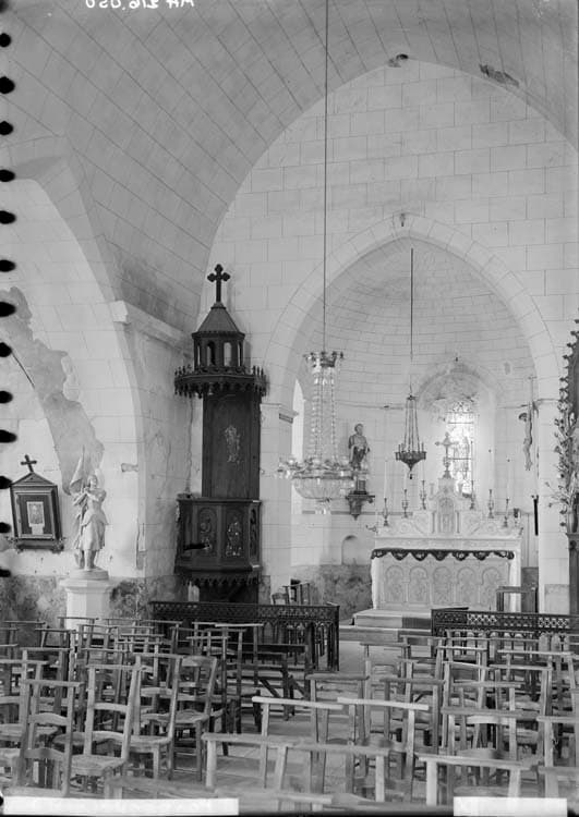 Eglise à choeur roman voûté en cul de four avec trois étroites fenêtres romanes. Chapelles latérales à voûtes d'arêtes. Clocher refait en 1680, primitivement ouvert de trois côtés avec des ouvertures en arcs brisés. Actuellement, il forme un vestibule sous lequel s'ouvre le porche en arc brisé très décoré. L'escalier à vis situé dans la tour ronde monte à une tribune contenant une cheminée en pierre.