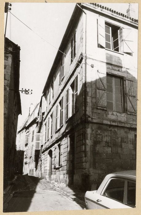 L'hôtel a remplacé, au 18e siècle, un logis reconstruit à la Renaissance par la famille de Meredieu dont les portraits et les armes du constructeur figurent dans les cartouches du plafond de l'escalier. Ce même logis Renaissance avait pris la place d'un autre qui existait au 14e siècle. Suivant la tradition périgourdine, une petite cour devait précéder l'entrée du logis. Le nouveau bâtiment a englobé cette cour en portant sa façade et son entrée directement sur la rue. Cette disposition a nécessité l'établissement d'un long couloir pour atteindre l'escalier. La face sud conserve, sur une partie, la trace de la construction primitive du 14e siècle sous forme d'une large porte en tiers-point à grands claveaux. La façade sur jardin est marquée par une légère avancée et comporte, à son angle sud-est, une petite tourelle polygonale tronquée. Le plafond du palier du premier étage est seul décoré de motifs sculptés. Ce plafond est divisé en trois caissons principaux subdivisés en plusieurs compartiments. Les sculptures représentent Adam et Eve, Eve prenant la pomme, l'Annonciation, la salamandre de François Ier...