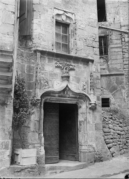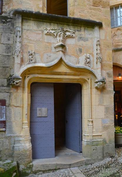 Façade en pans de bois en encorbellement, reposant sur des corbeaux en pierre de taille moulurée, présentant les caractéristiques de construction du 16e siècle dans la région. Une porte ornée de fleurons et de pinacles donne accès à l'escalier à vis contenu dans une tourelle octogonale en pierre de taille.