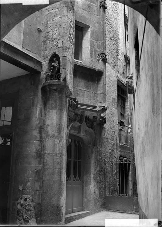 Maison en partie du 16e siècle, côté cour, avec tourelle d'escalier. Une porte arrondie donne accès à la cour intérieure. Au deuxième étage, ouvertures séparées par des pilastres plats à chapiteaux corinthiens à gauche, deux pilastres cannelés encadrent les deux ouvertures. Lucarne à fronton entrecoupé avec coquille.