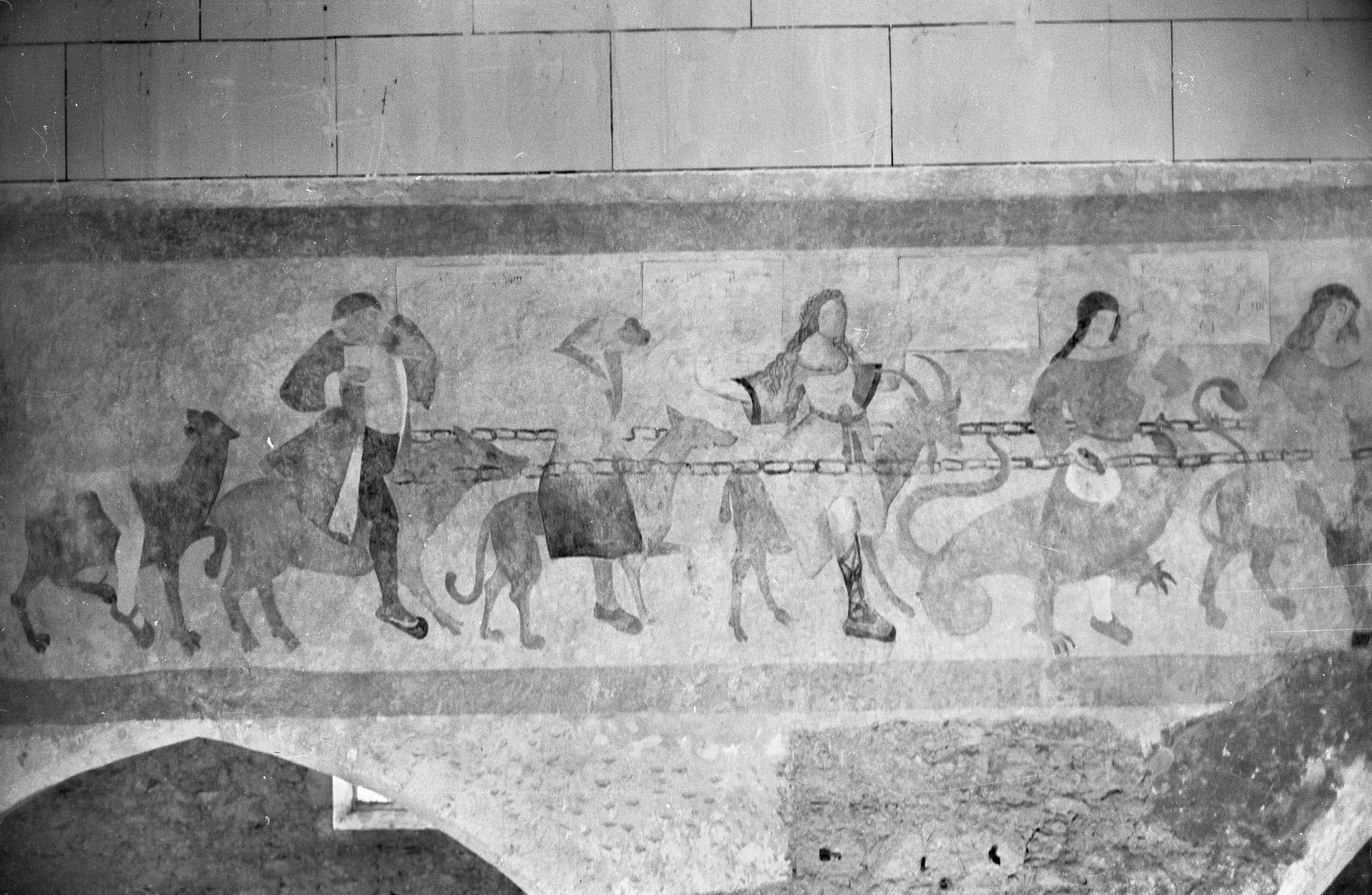 L'église paraît dater du 13e siècle, avec des modifications et une réfection du mur du choeur datant probablement du 15e siècle. Un bas-côté a dû être ajouté sur la face sud au 17e siècle. L'église primitive présentait sans doute un plan tréflé. Les colonnes entre les piliers du choeur s'ornent de chapiteaux très frustes à figures humaines. Les chapiteaux de l'arc triomphal paraissent postérieurs (Daniel dans la fosse aux lions ; David et Goliath). Les fresques du 13e siècle se situent sur le mur nord du choeur ainsi que sur le mur sud (Christ), sur le mur nord de la nef (Sainte Catherine) et sur le mur sud de celle-ci (sept péchés capitaux). La nef est couverte par un plafond en bois du 17e siècle. Un chapiteau romain est utilisé en guise de bénitier.