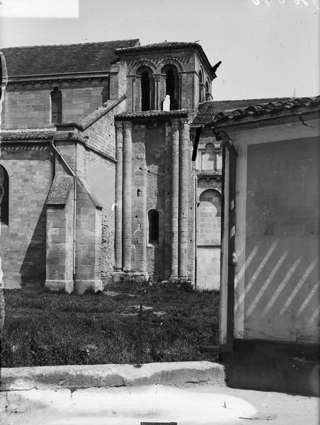 Le clocher, renforcé extérieurement par des colonnes engagées, se termine par un étage largement ajouré de baies romanes.